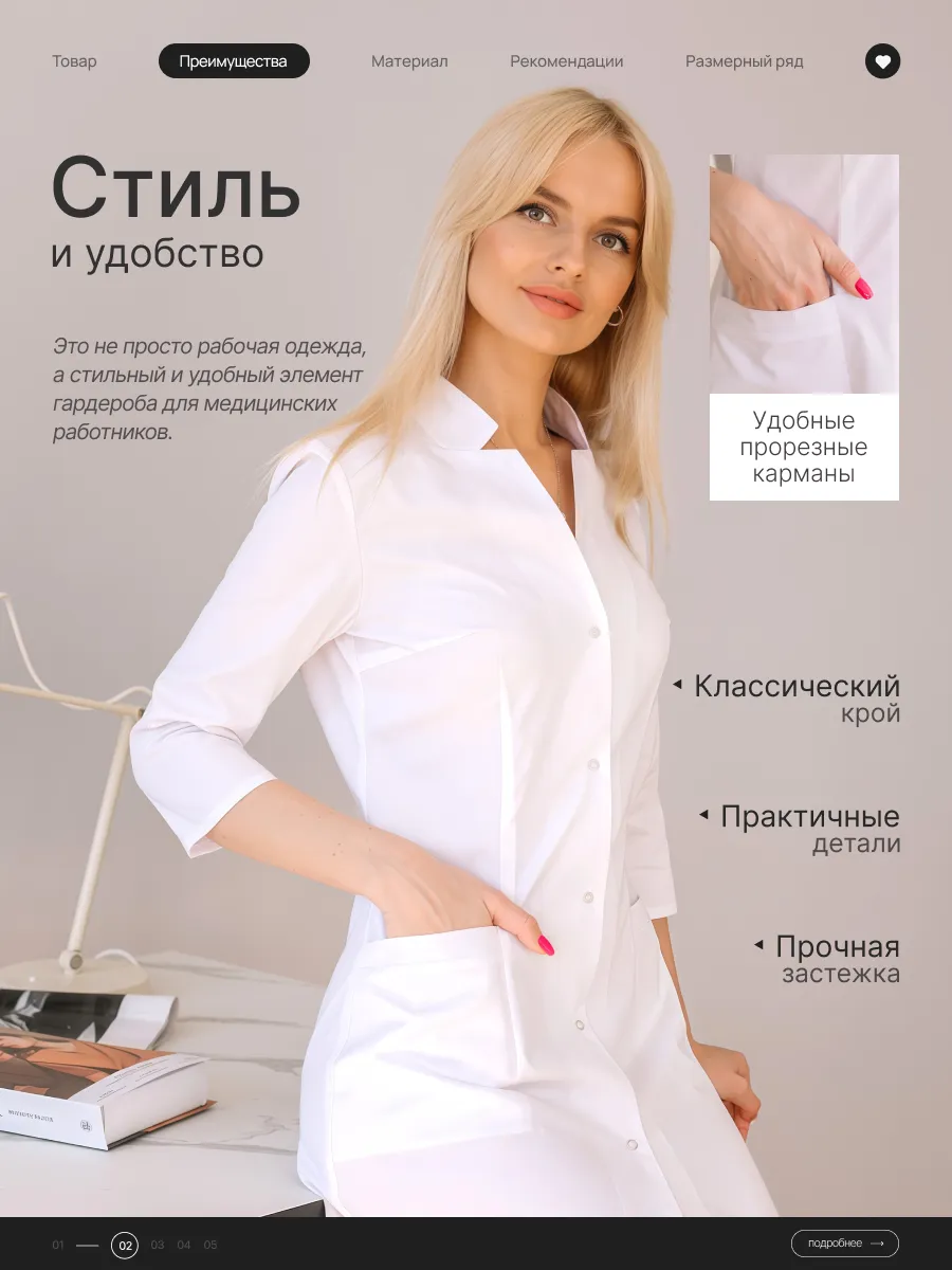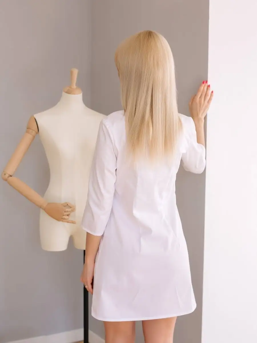 Продуманный крой не сковывает движения (полуприлегающий силуэт, свободные проймы), Вам будут удобно во время работы. Практичные прорезные карманы, позволят держать под рукой ручку, блокнот, телефон.