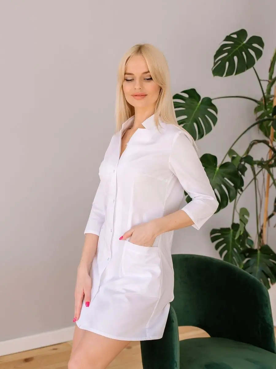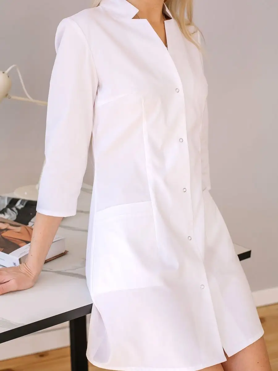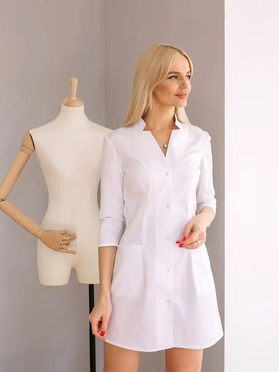 Стильный женский медицинский халат подойдет как для медработников, частных клиник, лабораторий, фельдшерам, фармацевтам, а так же для косметологам, салонам красоты, спа-центрам, где ценят время и проводят на ногах по 12 часов. Благодаря составу (55% хлопок, 45% полиэстер) ткань не мнется, позволяет коже дышать и выдерживает частые стирки, при высоких температурах, без потери формы и цвета. Никакой «серости» и желтизны – только ослепительный белый цвет день за днем.
