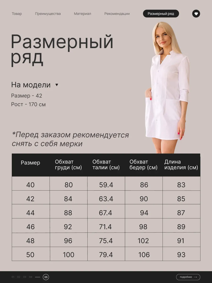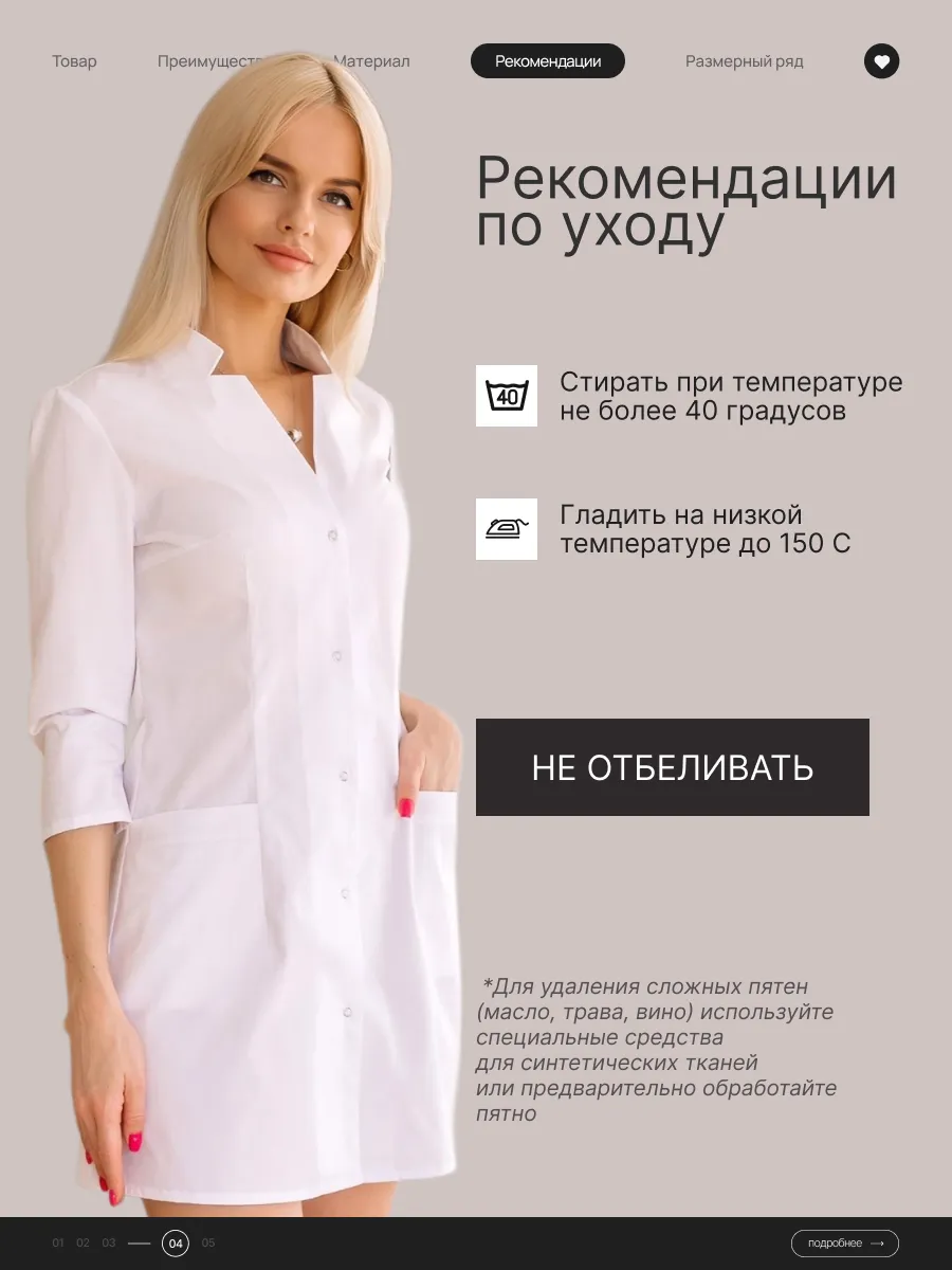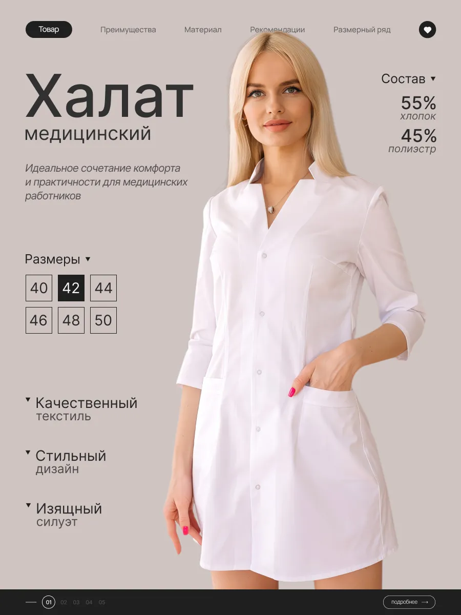 Стильный женский медицинский халат подойдет как для медработников, частных клиник, лабораторий, фельдшерам, фармацевтам, а так же для косметологам, салонам красоты, спа-центрам, где ценят время и проводят на ногах по 12 часов. Благодаря составу (55% хлопок, 45% полиэстер) ткань не мнется, позволяет коже дышать и выдерживает частые стирки, при высоких температурах, без потери формы и цвета. Никакой «серости» и желтизны – только ослепительный белый цвет день за днем.